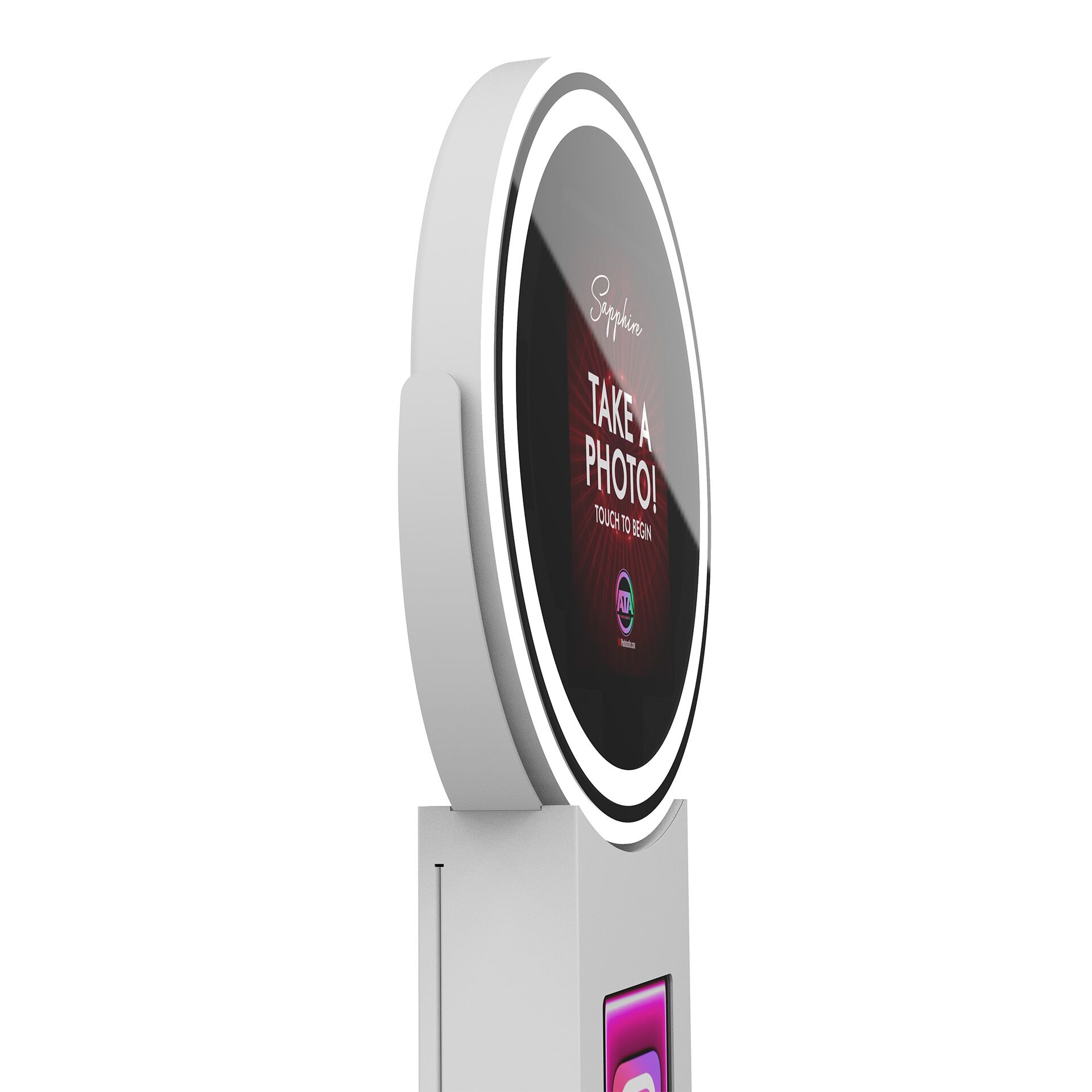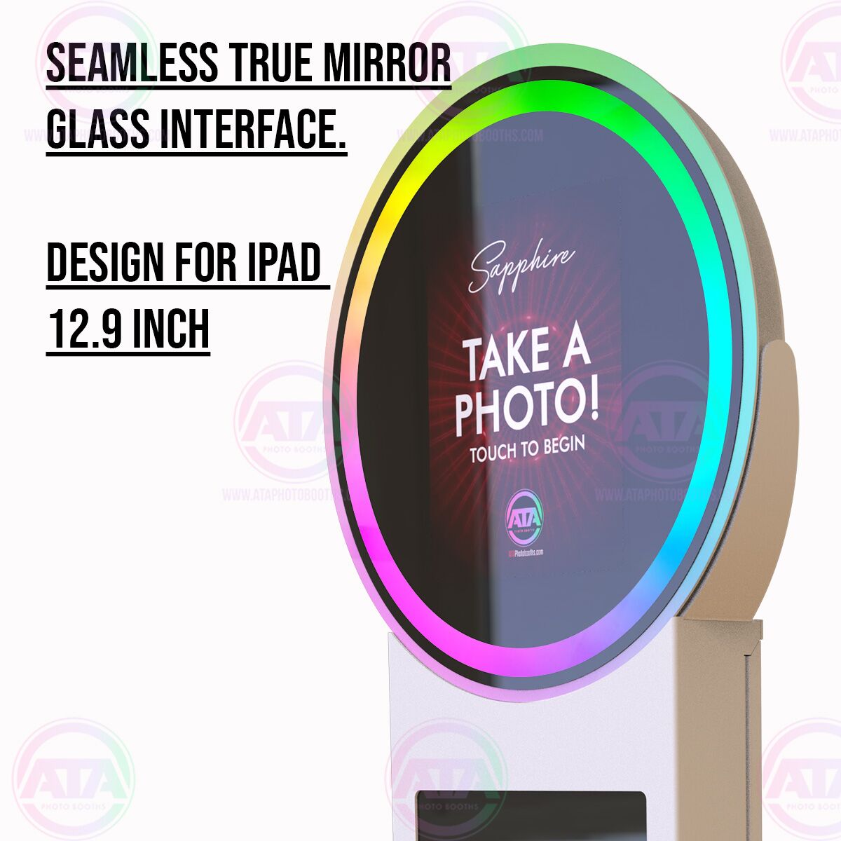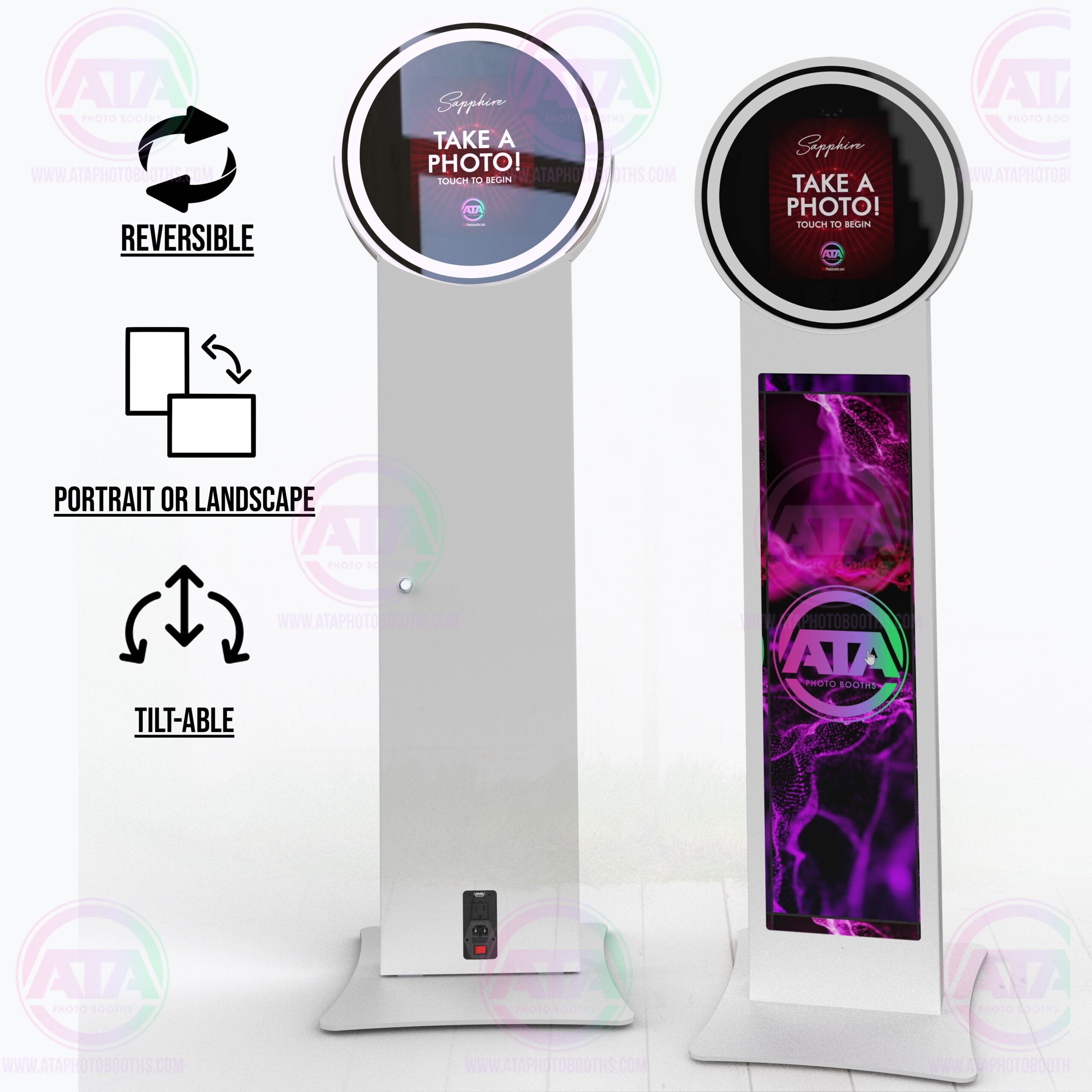 This Sapphire Helio iPad Mirrored Photobooth from ATA Photobooths is a great way to capture head-turning looks at every event. With a halo ring light attachment for the best lighting, you can mount your helio photobooth in either portrait or landscape mode as needed. The powerful analytics software lets you track all of the crucial data and save it to the cloud for simple and easy use. Not only that, but its advanced social media sharing functions work directly with the most popular sites. ATA Photobooths is your number one source for building your photobooth business with amazing, high-quality products. Give your customers an outstanding experience with a photo they’ll cherish for a lifetime. Get your Sapphire Helio Photobooth from ATA Photobooths today.