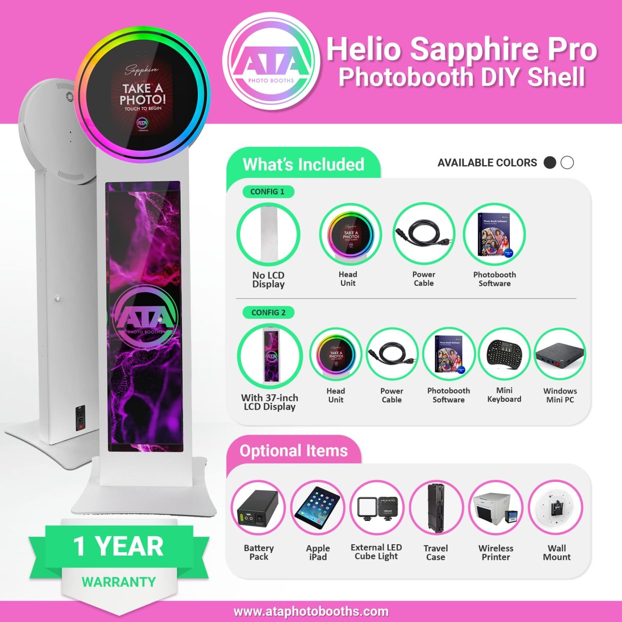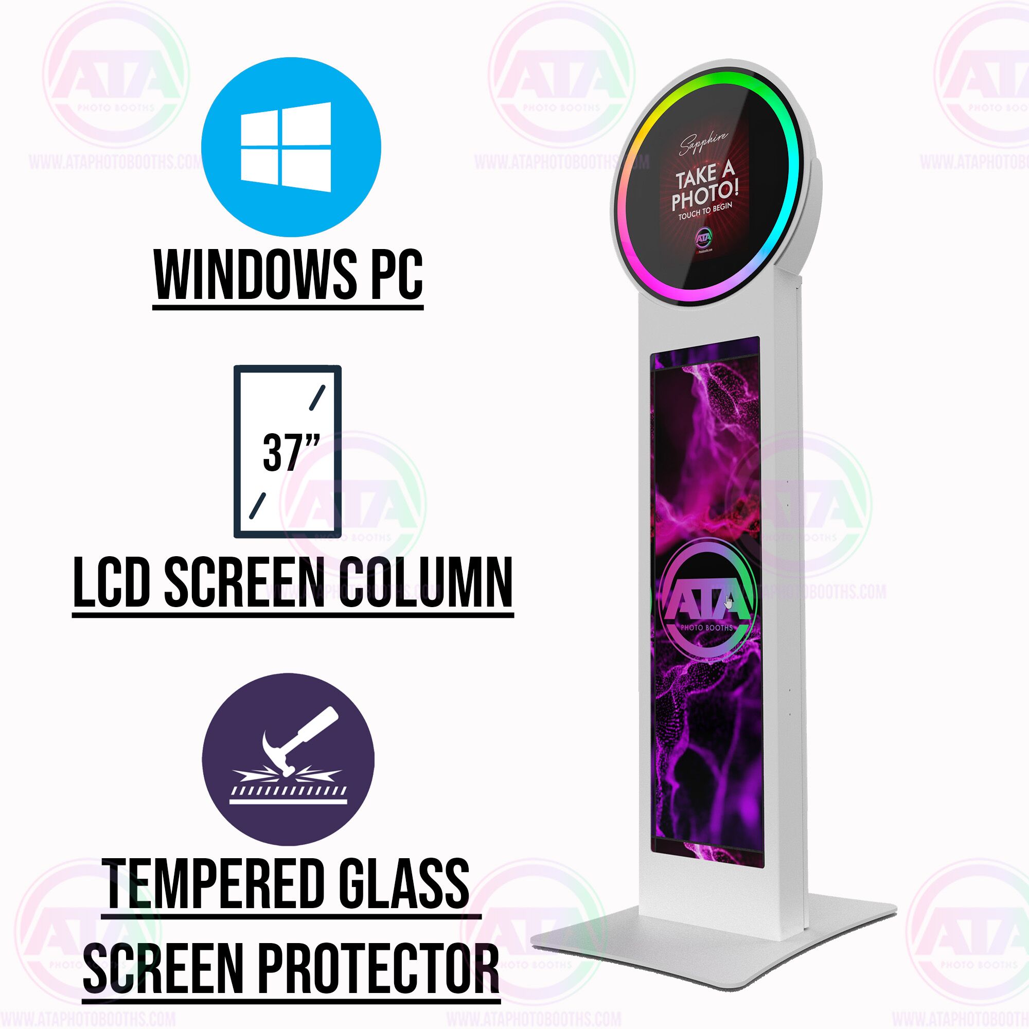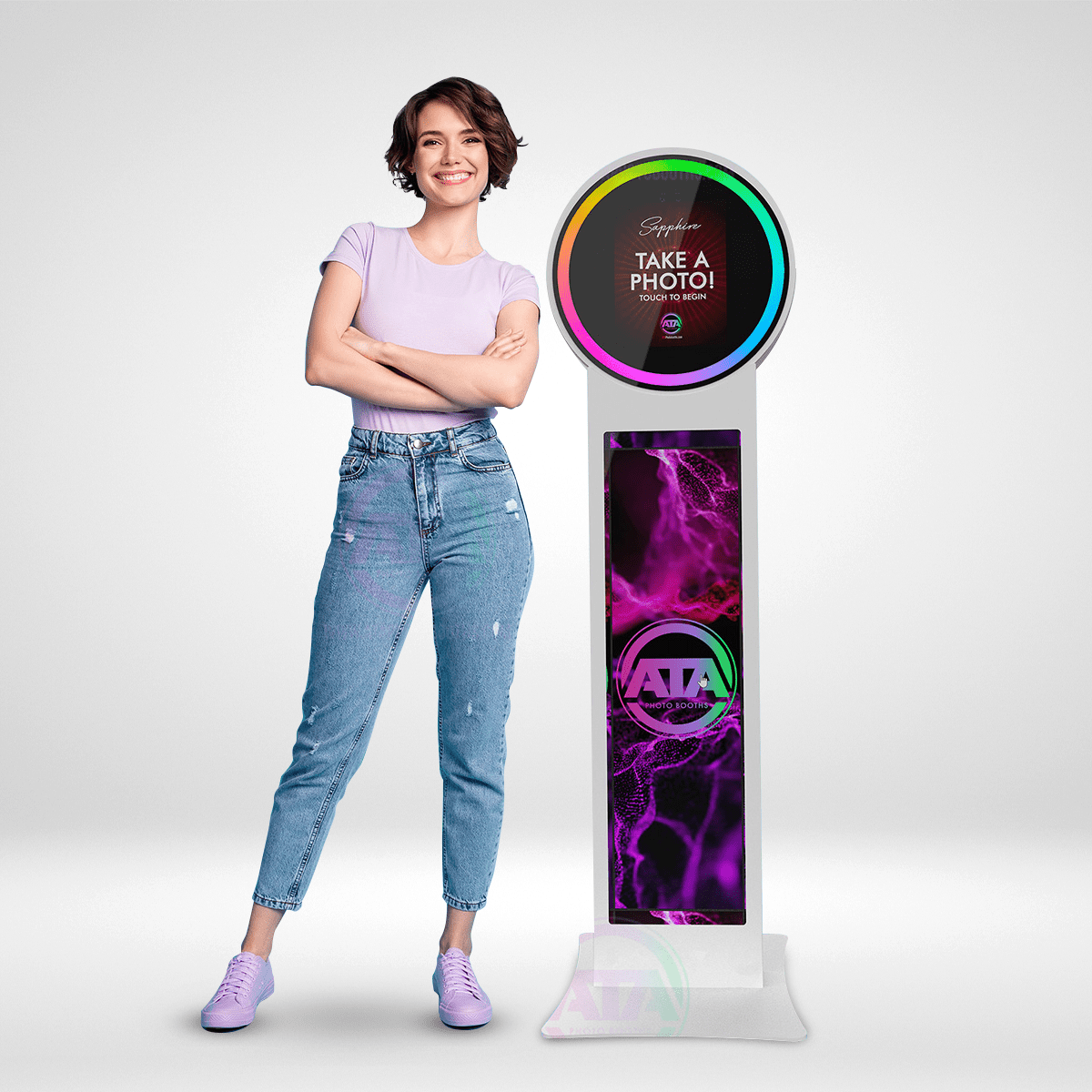 This Sapphire Helio iPad Mirrored Photobooth from ATA Photobooths is a great way to capture head-turning looks at every event. With a halo ring light attachment for the best lighting, you can mount your helio photobooth in either portrait or landscape mode as needed. The powerful analytics software lets you track all of the crucial data and save it to the cloud for simple and easy use. Not only that, but its advanced social media sharing functions work directly with the most popular sites. ATA Photobooths is your number one source for building your photobooth business with amazing, high-quality products. Give your customers an outstanding experience with a photo they’ll cherish for a lifetime. Get your Sapphire Helio Photobooth from ATA Photobooths today.